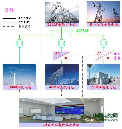 2012年09月新華社記者曾對該項(xiàng)目進(jìn)行過一次實(shí)地采訪。該電站生產(chǎn)部主任劉漢民博士解釋說“當(dāng)風(fēng)電、光伏發(fā)電出力足夠時,可將多余的發(fā)電出力儲存到電池中;一旦風(fēng)光出力不夠時,儲能系統(tǒng)就可以放出電量。而這一切,是通過聯(lián)合發(fā)電智能監(jiān)控系統(tǒng)實(shí)現(xiàn)的。它是整個風(fēng)光儲電站的‘大腦’,可改善風(fēng)電、光伏出力的波動性和間歇性,使之安全穩(wěn)定地并入電網(wǎng)運(yùn)行。”與此同時,國家電網(wǎng)還自主開發(fā)了一套儲能監(jiān)控系統(tǒng),二者結(jié)合,可實(shí)現(xiàn)與上級調(diào)度無縫連接。