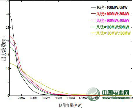 從圖6下可以看到,在張北地區(qū)的風(fēng)光資源條件下,單純輸出風(fēng)電的出力波動為30%,而風(fēng)電與光電以1:1的比例一起發(fā)電時的聯(lián)合出力波動為12%,如果再加上適當(dāng)配比的儲能電池系統(tǒng)參與,波動會降至5%以下。國家電網(wǎng)認(rèn)為,風(fēng)光比例越小,儲能平抑作用就越明顯。在經(jīng)過對5種風(fēng)光比例(風(fēng)力發(fā)電均為100MW,而光伏發(fā)電則有0、30、40、50、100MW 5種)比較之后,國家電網(wǎng)得出的結(jié)論是:儲能容量為20~40MW時,平抑波動效率最高;儲能容量為60~80MW時,平抑波動效果最佳。從張北項(xiàng)目一期工程來看,風(fēng)光發(fā)電規(guī)模比例為100MW:40MW,實(shí)際采用的儲能裝置規(guī)模為20MW,取了平抑波動效率最高的20~40MW的階段中的最低值。