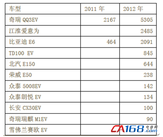 根據(jù)汽車工業(yè)協(xié)會的數(shù)據(jù),2012年我國新能源汽車生產(chǎn)了12552輛,其中純電動汽車11375輛,插電式混合動力汽車1311輛。銷售新能源汽車12791輛,其中純電動汽車11375輛,純電動汽車產(chǎn)銷量分別比2