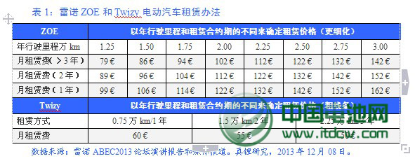 中國電池雜志-中國電池網戰略合作伙伴——真鋰研究曾于2012年09月《鋰電信息動態與分析》(產業研究月度報告)中介紹了雷諾微型電動汽車(可以歸納為低速電動汽車這一類)Twizy(配備6.1kWh電池組,由LG化學提供)的租賃辦法,本次演講雷諾介紹了其2012年11月推向市場的電動汽車ZOE(長4,084mm,軸距2,588mm,是一款兩廂的緊湊型純電動汽車,配備22kWh的鋰離子電池組,由LG化學提供;該車的公開售價為1.37萬歐元(含7,000歐元的政府采購補貼,但不包括電池組在內))的租賃辦法,我們將二者對比看一下,見表1: