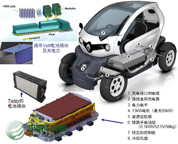 Twizy的電池模塊與Volt的對比(Twizy尺寸為長2,335×寬1,228×高1,451mm,軸距1,686mm,整備質量467kg;電機功率13kW,最大20kW;最大扭矩57N·m;最高時速80km/h;一次充電最大續航里程:100km(廠家提供數據),83km(第三方提供數據))