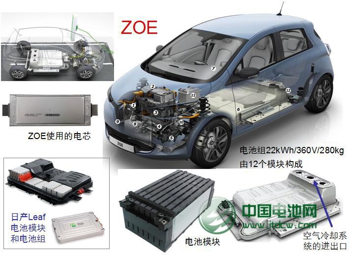 ZOE的電池模塊與Leaf的對比(ZOE尺寸為長4,084×寬1,730×高1,562mm,軸距2,588mm,整備質量467kg;電機功率66kW,最大80kW;最大扭矩271N·m;最高時速135km/h;一次充電最大續航里程:210km(廠家提供數據),160km(第三方提供數據))