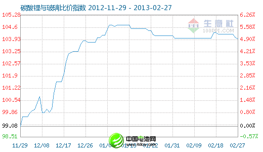 2月27日碳酸鋰與玻璃商品比價(jià)指數(shù)為103.97,較昨日下降了0.07點(diǎn),較周期內(nèi)最高點(diǎn)119.84點(diǎn)(2012-08-08)下降了13.24%,較2012年11月06日最低點(diǎn)92.78點(diǎn)上漲了12.06%。(注:周期指2012-01-01至今)