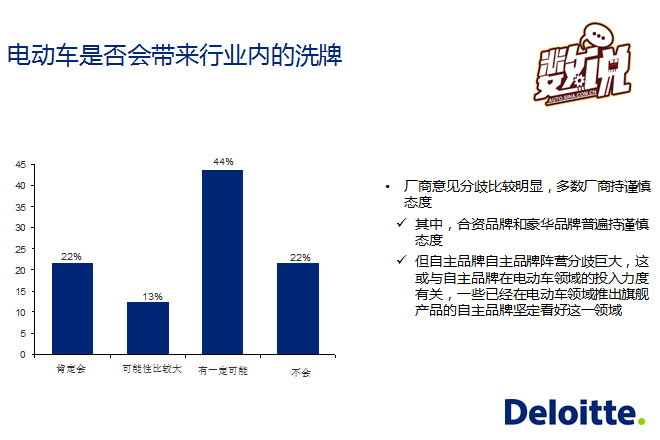 針對電動車是否會帶來行業內的洗牌,主要廠商意見分歧比較明顯,主流觀點是會帶來一定的改變。其中,合資品牌和豪華品牌普遍持謹慎態度,而自主品牌自主品牌陣營分歧巨大,這或與自主品牌在電動車領域的投入力度有關,一些已經在電動車領域推出旗艦產品的自主品牌堅定看好這一領域。