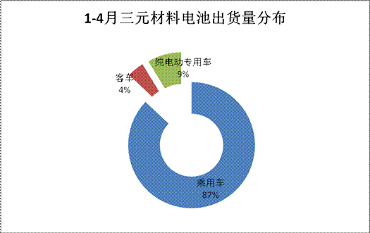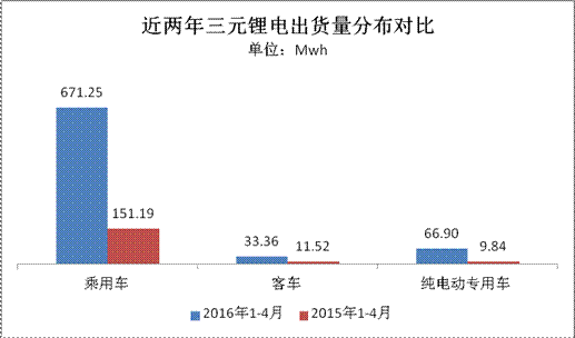 三元鋰電池方面,此前政策要求暫停三元鋰電應用于客車領域,但從今年與去年同期出貨量數據比較看,這對三元鋰電的總產能并未造成太大影響,與2015年1-4月三元鋰電池出貨量(172.55Mwh)對比,今年實現了3.47倍的同比增幅,凈增量達600Mwh。細分看,三元鋰電在客車領域的變化基本不達,僅增21Mwh左右;對應的其產能在乘用車領域的增幅最為明顯,同比增幅達3.44倍,凈增量達520Mwh;其次,三元鋰電在專用車領域的變化也伴隨專用車產量的走勢逐步遞增,電池搭載量增量達57Mwh,增幅達5.7倍。