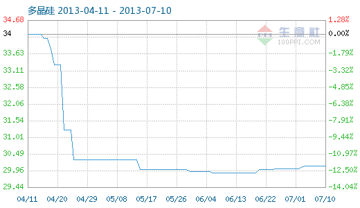 7月10日多晶硅商品指數為30.10,與昨日持平,較周期內最高點100.00點(2011-09-08)下降了69.90%,較2012年12月24日最低點29.12點上漲了3.37%。(注:周期指2011-09-01至今)