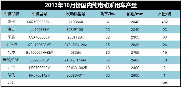2013年10月份國內(nèi)純電動乘用車總產(chǎn)量692輛,其中奇瑞482輛,占比70%以上;其次是康迪93輛,占比13%;榮威、比亞迪、北京、賽歐依次占比9%、4%、2%、2%,江淮和哈飛最少,總共就3輛。