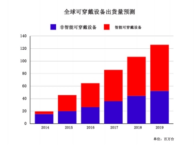 全球可穿戴設(shè)備2015年的出貨量將達到4570萬,而2019年的出貨量將達到1.261億,這意味著大約45%的年增長率。