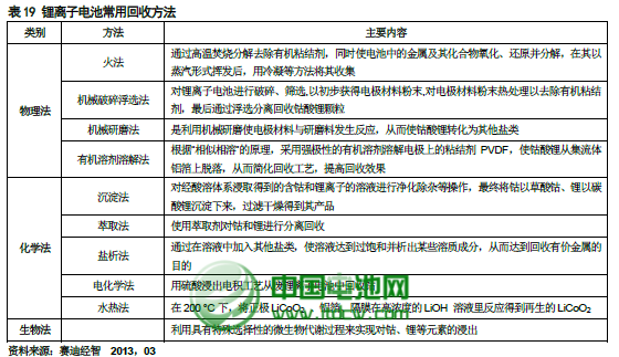 目前廢鋰離子電池的回收利用研究主要集中于電池中正極活性物質的回收利用方法。一般來說,根據所采用的主要關鍵技術,可以將廢鋰離子電池的資源化處理過程分為物理法、化學法和生物法這三類。