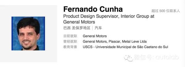 Fernando Cunha是前通用汽車的產(chǎn)品設(shè)計(jì)主管,主要負(fù)責(zé)汽車儀表盤、中控臺(tái)和車門飾件的設(shè)計(jì)工作。