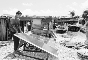 三沙市鴨公島居民正在擺放太陽能光伏電池板。 本報記者 宋國強 通訊員 田培 攝