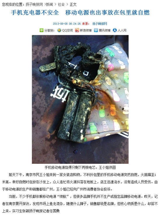 《揚(yáng)子晚報(bào)》在8月6日?qǐng)?bào)道:南京市民王小姐來(lái)到南京一家女裝店內(nèi)購(gòu)物,她將拎包放在沙發(fā)上,坐在一旁歇息。突然,王小姐聽(tīng)到包內(nèi)發(fā)出“噗嗤”一聲響,隨后拎包還抖了一下。打開(kāi)一看,王小姐發(fā)現(xiàn)1個(gè)月前買(mǎi)的手機(jī)移動(dòng)電源有些鼓脹,一摸還很燙手。那一刻,王小姐意識(shí)到移動(dòng)電源可能會(huì)自燃,便用紙巾捏住電池準(zhǔn)備拿出來(lái)。就在她取出移動(dòng)電源的瞬間起火了。她迅速將電源抖落在地,但是火苗已經(jīng)將拎包燒出一個(gè)大窟窿。王小姐心有余悸地告訴記者,當(dāng)時(shí)電池躥出的火苗最高約1米,噴濺到人身上肯定會(huì)被灼傷。當(dāng)時(shí)服裝店內(nèi)煙霧彌漫,焦糊味刺鼻。電池外殼幾乎燒光,留下兩根電芯。再一看,沙發(fā)被熏黑了,地板留下一塊電池形狀的深深烙印。