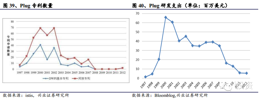 Plug公司有一定數量的基本專利,從1997年開始到2000年申請專利迅速增長,而其后維持在較高量上波動,而從2003年開始專利數量急劇萎縮,特別是從2008年開始到2012年間公司幾乎沒有申請專利。結合公司的研發支出來看,和專利申請基本保持一致。從2008年到2012年公司研發支出都在2千萬美元以下,大大低于高峰時期的6千萬美元,故而認為公司從1997年到2007都處于研發階段,而從2009年開始則轉向將專利市場化。