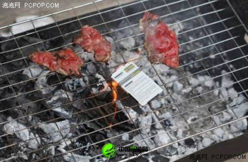 大約6分30秒左右的時候,烤肉已經焦糊,而KINGMAX電池的包裝外皮開始融化,電池也開始出現微微膨脹現象,證明其內部已經開始充滿化學氣體。這時全體人員的心也隨著電池的膨脹開始糾結起來,一方面隨時準備接受可能來臨的“砰聲一響”并隨時躲避可能出現的“彈片四射”;一方面又有些期待能看到爆炸的震撼場面。