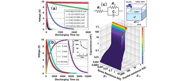 研究人員將電路的快速充電和緩慢放電歸因于大電阻的堰塞效應(yīng)。他們認(rèn)為電阻和超級電容器電容的關(guān)系類似于水箱中塞子大小和存水量的關(guān)系。塞子(電阻)越大,水箱中可以儲存的水量(電容)越多。直到現(xiàn)在,很多電路中用于儲能的RC組合的堰塞效應(yīng)仍被忽視。