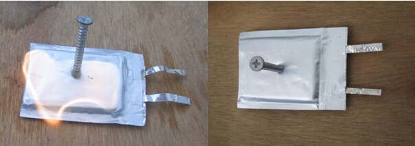 圖1 液態(tài)鋰電池(左圖)和全固態(tài)聚合物鋰電池(右圖)的滿電態(tài)穿刺安全性能測試