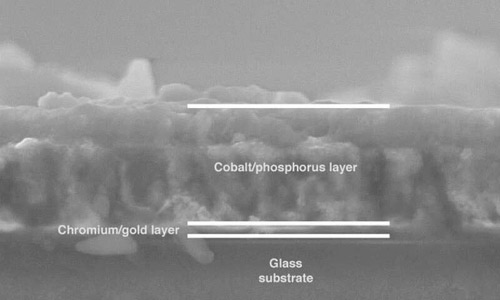 實驗室通過氧化鈷薄膜的陽極并將其沉積到基板上,從而得到這種500納米厚的鈷薄膜。再將基板放在磷蒸汽下烘烤2小時,形成鈷/磷化物/磷酸鹽薄膜,這種薄膜的孔結構不會被破壞。并且,這個材料在疲勞試驗和酸堿條件下均具有良好的性能。