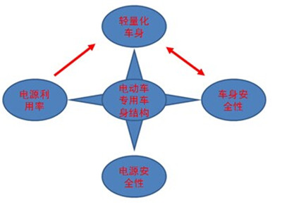 一圖詳解電動車車身結構與安全性的關系:因低速電動車電池能源有限,要提高電源利用率,勢必采用輕量化車身,而輕量化與車身安全的關系是一個矛盾;另外就是是電動車中如何保證碰撞中的電源安全問題。