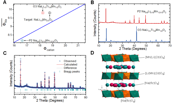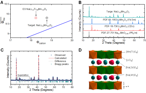 圖2.根據(jù)陽離子勢設(shè)計富鈉O3材料。(A)Na-Li-Mn(Ti)-O的陽離子勢分析;(B)初始組成Na[Li1/3Mn2/3]O2的XRD圖譜和相關(guān)標(biāo)準(zhǔn)圖譜;(C)O3-Na[Li1/3Ti1/6Mn1/2]O2的結(jié)構(gòu)精修XRD圖譜;(D)[Li1/3Ti1/6Mn1/2]O2層中Li/Mn(Ti)有序排布的結(jié)構(gòu)示意圖
