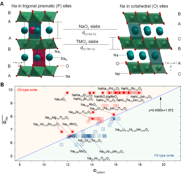 圖1.陽離子勢及其在鈉離子層狀氧化物中的應(yīng)用。(A)典型P2型和O3型鈉離子層狀氧化物晶體結(jié)構(gòu)示意圖;(B)具有不同鈉含量、不同過渡金屬氧化態(tài)和組成的P2型和O3型鈉離子層狀氧化物在以陽離子勢Φcation為橫坐標(biāo),鈉的加權(quán)平均離子勢