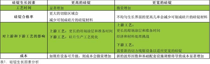 還有其它一些與生產更大硅錠相關的上游和下游生產問題,這些問題會影響生產成本,因此必須在固定資產設備的采購決策中加以考量。從上游來說,坩堝成本將隨著坩堝尺寸的增加而增加,而坩堝的準備成本也會隨著涂層工藝的日益復雜而增加。從下游來說,更寬的硅錠可能需要更大的切方線鋸設備來進行處理。最后,如果硅錠生長和線切割操作之間的生產線平衡無法維持,總體硅片生產力也會下降。生產更多可制成硅片的硅錠材料可能會增加生產能力和爐子的利用率,但如果線切割操作無法處理增加后的材料或波形因數,就可能會出現在制品(WIP)瓶頸或降低線鋸利用率,從而導致硅片生產運營的總體生產力下降。影響硅錠生長的因素分析見表1。