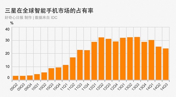僅僅一年前,三星還是手機業的奇跡。這家公司2010年才真正進入智能手機市場,兩年之后它便超過諾基亞、黑莓、蘋果、HTC等先行者,成為全球最大的智能手機廠商。到2013年,智能手機的幾乎全部利潤都被蘋果和三星兩家公司瓜分。