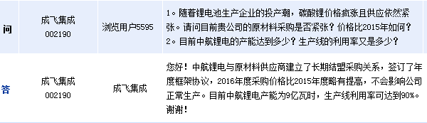 成飛集成表示,中航鋰電與原材料供應商建立了長期結盟采購關系,簽訂了年度框架協議,2016年度采購價格比2015年度略有提高,不會影響公司正常生產。