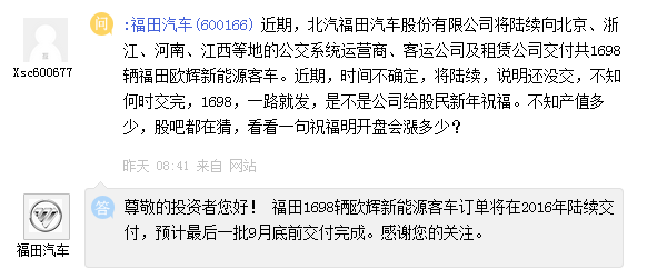 福田汽車(600166)周二在上證e互動平臺表示,福田1698輛歐輝新能源客車訂單將在2016年陸續(xù)交付,預計最后一批9月底前交付完成。