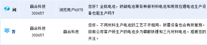 贏合科技(300457)周二在全景網(wǎng)互動平臺上表示,不同材料生產(chǎn)電池的工藝不盡相同,所需設(shè)備也會有所差別。目前公司客戶所生產(chǎn)的電池多為磷酸鐵鋰和三元材料電池。
