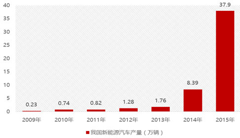 2009年以來,我國新能源汽車的產量連年上升,帶動了動力電池行業的飛速發展。據工信部數據顯示,2015年我國生產新能源汽車37.90萬輛,同比增長4倍。其中純電動乘用車生產29.07萬輛,插電式混合動力乘用車生產8.82萬輛,較2014年增長均超過3倍。