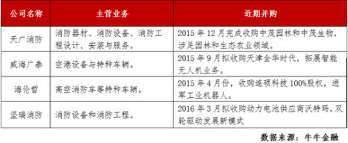 2015年12月,天廣消防完成了對中茂園林和中茂生物的收購,公司進入園林和生物制品領域,形成了三主業驅動的發展模式。海倫哲則是在擁有消防車輛、特種車輛的基礎上,收購工業機器人企業連碩科技,目前公司消防車輛、特種車輛、LED照明、工業機器人等多領域發展,協同效應明顯。而威海廣泰自 2009 年以來,先后收購北京中卓時代、營口新山鷹、天津全華時代(收購正在實施),形成了“以空港設備為基礎業務,以消防設備為發展業務,以無人機和軍品為新興業務”的戰略布局。