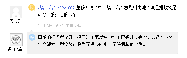 福田汽車(600166)周二在上證e互動平臺表示,福田汽車氫燃料電池車已經(jīng)開發(fā)完畢,具備產(chǎn)業(yè)化生產(chǎn)能力。燃燒終產(chǎn)物為無污染的水,無任何其他雜質(zhì)。