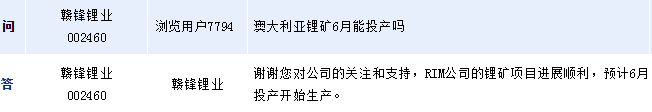 贛鋒鋰業(yè)(002460)周四在全景網(wǎng)互動平臺上表示,RIM公司的鋰礦項目進展順利,預(yù)計6月開始投入生產(chǎn)。