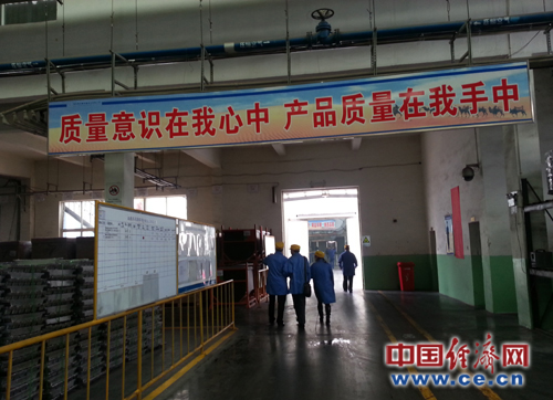 圖為湖北駱駝集團股份有限公司路明占、楊詩軍副總裁以及負責產品質量的管理層在該公司連鑄連軋極板生產線的車間里,向記者詳細地介紹公司的戰略轉型升級、搶占自主核心技術的細節。攝影:中國經濟網記者 蘇蘭
