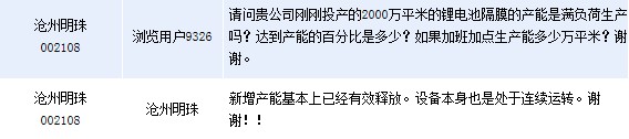 15日晚間滄州明珠(002108)在全景網互動平臺上表示,鋰電池隔膜新增產能基本上已經有效釋放。設備本身也是處于連續運轉。