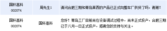 國軒高科(002074)周四在全景網互動平臺上表示,公司動力鋰電池現有產能為7.5億安時,隨著本季度合肥三期及青島工廠的即將正式投產,公司產能規模將提升至16.5億安時。