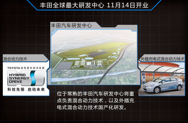 位于常熟的豐田汽車研發中心是豐田在華首個非合資獨立研發中心,同時也是豐田全球最大規模的研發中心,總投資6.89億美元。該研發中心主要負責節能、新能源車零部件國產化研發。其中,混合動力技術中的電機、電池、變速器和逆變器都將實現國產。此外,未來研發中心還將針對國內市場,為一汽豐田和廣汽豐田這兩家合資公司提供包括發動機、動力總成在技術上的支持和協助。