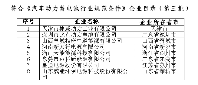 4月6日,工信部裝備工業司發布符合《汽車動力蓄電池行業規范條件》企業目錄(第三批)。共有8家企業入選,分別為天津市捷威動力工業有限公司、深圳市比克動力電池有限公司、山西皇城相府中道能源有限公司、河南新太行電源有限公司、浙江天能能源科技有限公司、東莞市邁科新能源有限公司、星恒電源股份有限公司、山東威能環保電源科技股份有限公司。