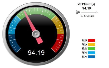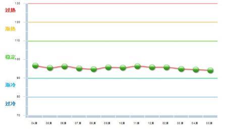 5月份中輕景氣指數為94.19,比上月下降0.36,位于“穩定”區域(參見圖1-1)。