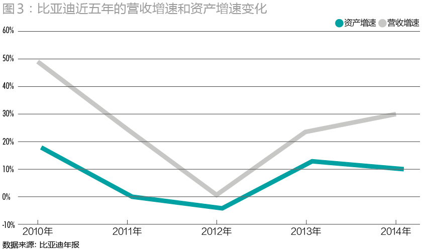 2011年比亞迪先后三次融資,獲得54.2億元資金。盡管在A股IPO的實際募資比預期額度21.92億元少7.7億元,但已是當時最后的融資機會。比亞迪2010年在汽車市場馬失前蹄,但是當年的營收增速依然達到17.84%,加之2009年48.28%、2008年30.72%的營收增速,為其順利融資留有機會。但2011年、2012年的經營情況繼續惡化,營收增速分別降至0.78%、-4.4%,直接反映在當年的財報數據上。上述融資項目如再推遲半年,王傳福的如意算盤只怕要落空。