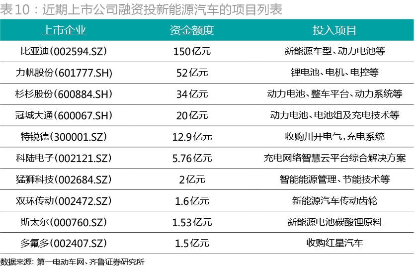 2015年5月以來,10余家上市企業(yè)宣布或者計劃增加對新能源汽車產業(yè)的投入(表10)。從新能源汽車領域的產能對比看,比亞迪已遙遙領先同行,在新能源汽車領域暫無匹敵者。比亞迪稱,今年計劃銷售新能源汽車6萬-7萬臺,其中K9大巴約5000臺,私家車5萬臺以上。