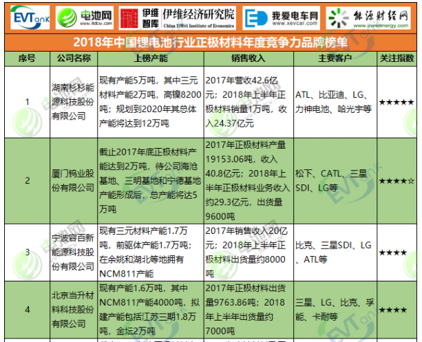 2018年中國鋰電池行業正極材料年度競爭力品牌榜單