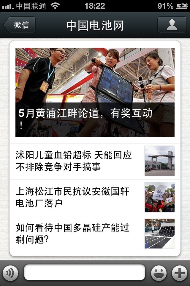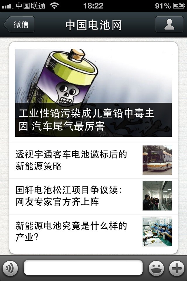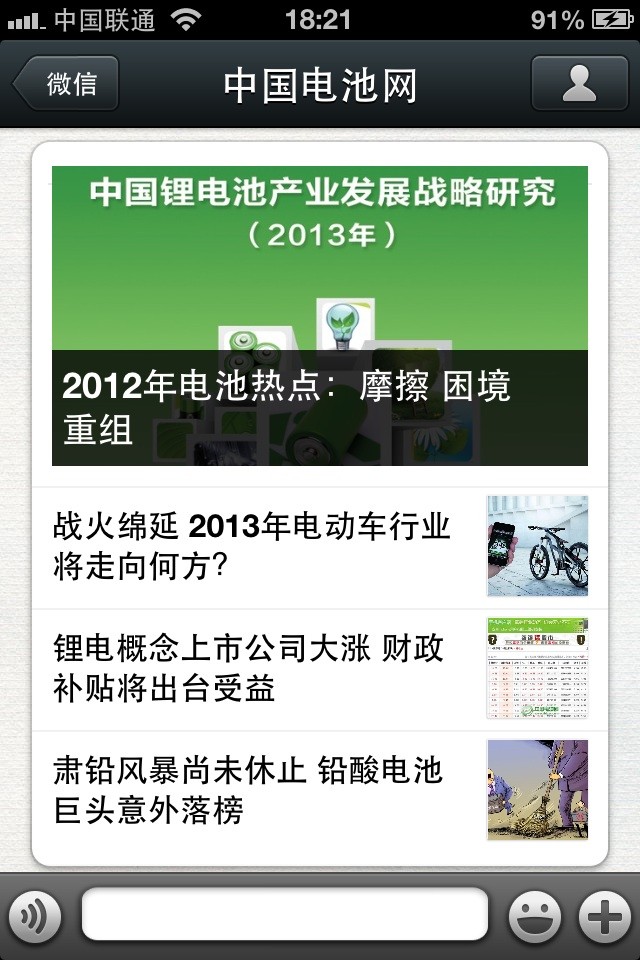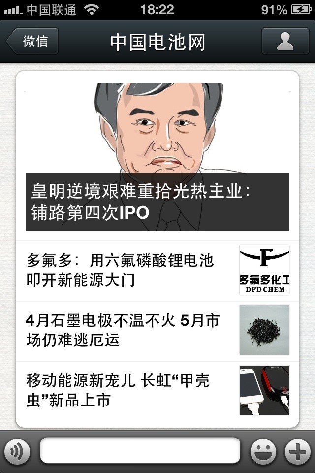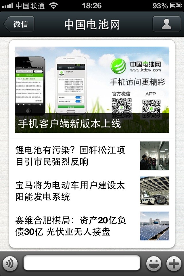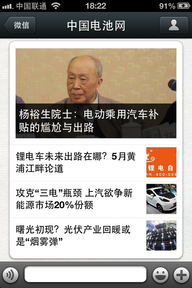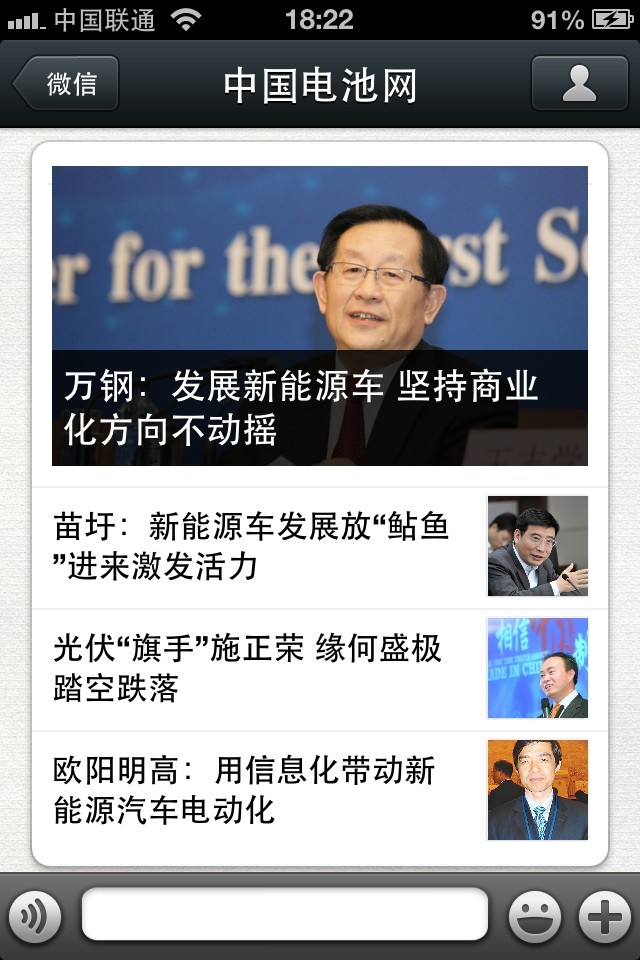 中國(guó)電池網(wǎng)的微信(微號(hào):mybattery)已運(yùn)行有6個(gè)月了,半年來機(jī)構(gòu)、企業(yè)用戶增加到近兩千,個(gè)人用戶也達(dá)到一千多,相比于動(dòng)輒上萬、十幾萬的微號(hào)來說,或許微不足道,但對(duì)于中國(guó)電池網(wǎng)來說卻是彌足珍貴,這些關(guān)注我們的用戶95%來自電池行業(yè)上中下游、券商機(jī)構(gòu)、VC/PE、能源媒體、國(guó)外客戶,是真實(shí)的人、熟悉的人!專業(yè)度高、粘性強(qiáng)、互動(dòng)性高。甚至有用戶發(fā)來微信,一天不看覺得少了點(diǎn)什么。是的,小微非常榮幸為大家服務(wù),并贏得信任和尊重。小微從中國(guó)電池網(wǎng)網(wǎng)站上精選內(nèi)容推送(有不少是獨(dú)家文章),不求最熱但求最有看頭。