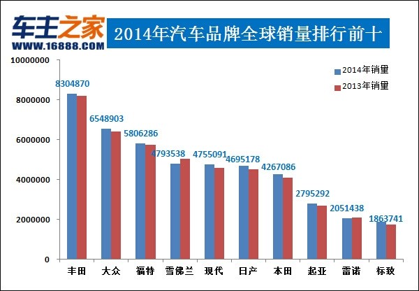 國外網站發布了2014年汽車品牌全球銷量排行榜。豐田以8304870輛的銷量領先,大眾次之。...