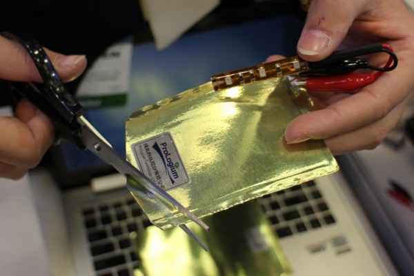 ProLogium在演示時(shí)該電池技術(shù)時(shí)接通一個(gè)LED,可以看到任何扭曲彎折之后,LED都照常發(fā)亮,甚至在裁切之后仍能正常供電。...