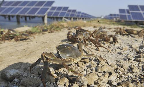 2013年10月24日,技術人員從新疆哈密石成子光伏園區的太陽能電池板旁走過。新疆哈密風電、光電資源豐富,截至目前,新疆哈密獲得核準風電項目55個,總規模426.9萬千瓦,現已有22個風電項目...