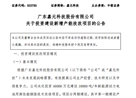 嘉元科技決定投資4.6億元建設10000噸/年新能源動力電池用高性能銅箔技術改造項目。項目分兩期建設,其中第一期建設產能為6500噸/年,總投資2.8億元,建設時間從2016年9月起至2017年12月止;第二期建設產能為3500噸/年,總投資1.8億元,建設時間從2017年1月至2018年12月。...